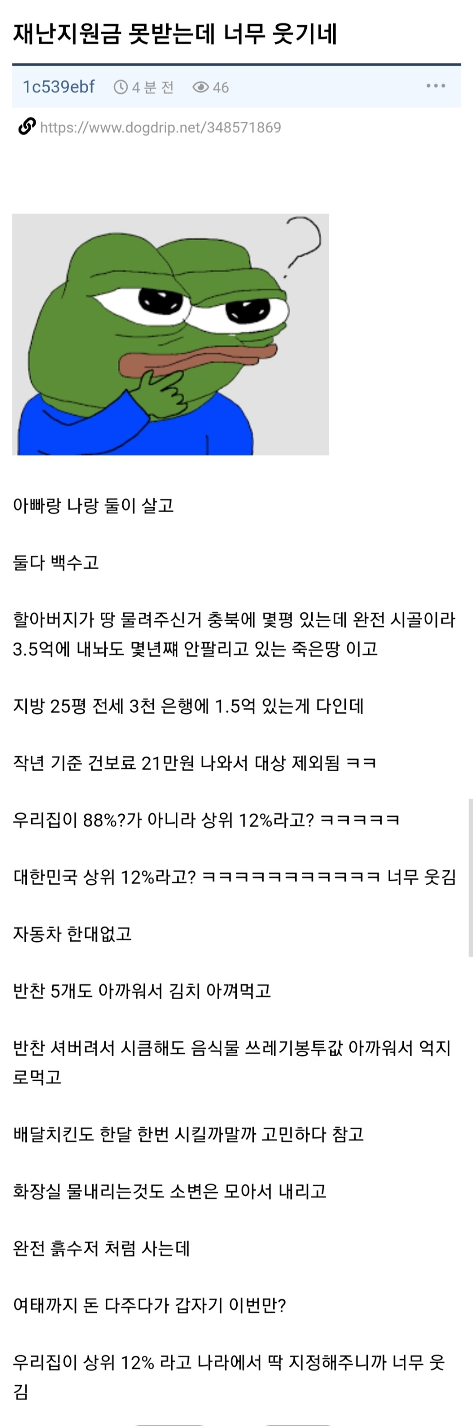 애초에 운용 가능한 현금자산이 억이 넘어가는데, 남들은 그렇게 놀리느니 어디든 굴린다 할 걸 냅둬도 되는 삶인데, 뭐가 아쉽다고 저런 '나도 힘들고 가난한데'란 푸념을...ㅋㅋㅋ 어차피 인터넷에 도는 글이야 뭐 자극적이라고 주작한 경우가 많지만, 실제로도 흔한 사고방식이라, 부자가 서민들에게 돌아갈 복지조차도 얼마나 탐내는지 쉽게 알 수 있음. ㅎㅎ | 25.03.20 23:50 | | |