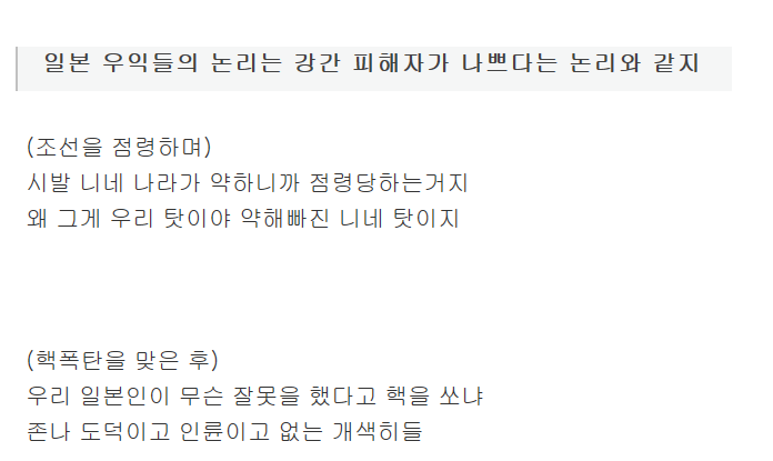 뭐지... 지들 원폭 맞은게 패자라서 맞은거라고? 개양아치짓하다가 이놈 하고 맞은거겠지!