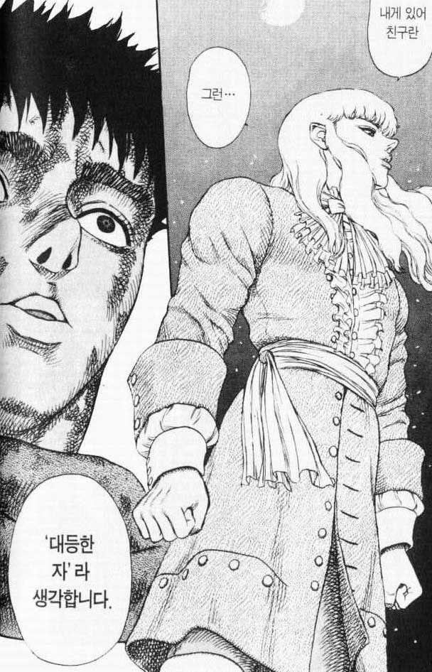 가츠 인생이 개박살 나는 교차점이 바로 이 지점 하필 그리피스 명령대로 암살하고 하수구로 도망쳐 나오다 걸린 게 이 때인데... 그리피스 편 드는 건 아니지만, 그리피스도 가츠를 대등한 친구보다 소유물이라 착각했고 가츠도 그리피스를 대등한 친구라기보다 자기보다 우월한 존재로 착각했고