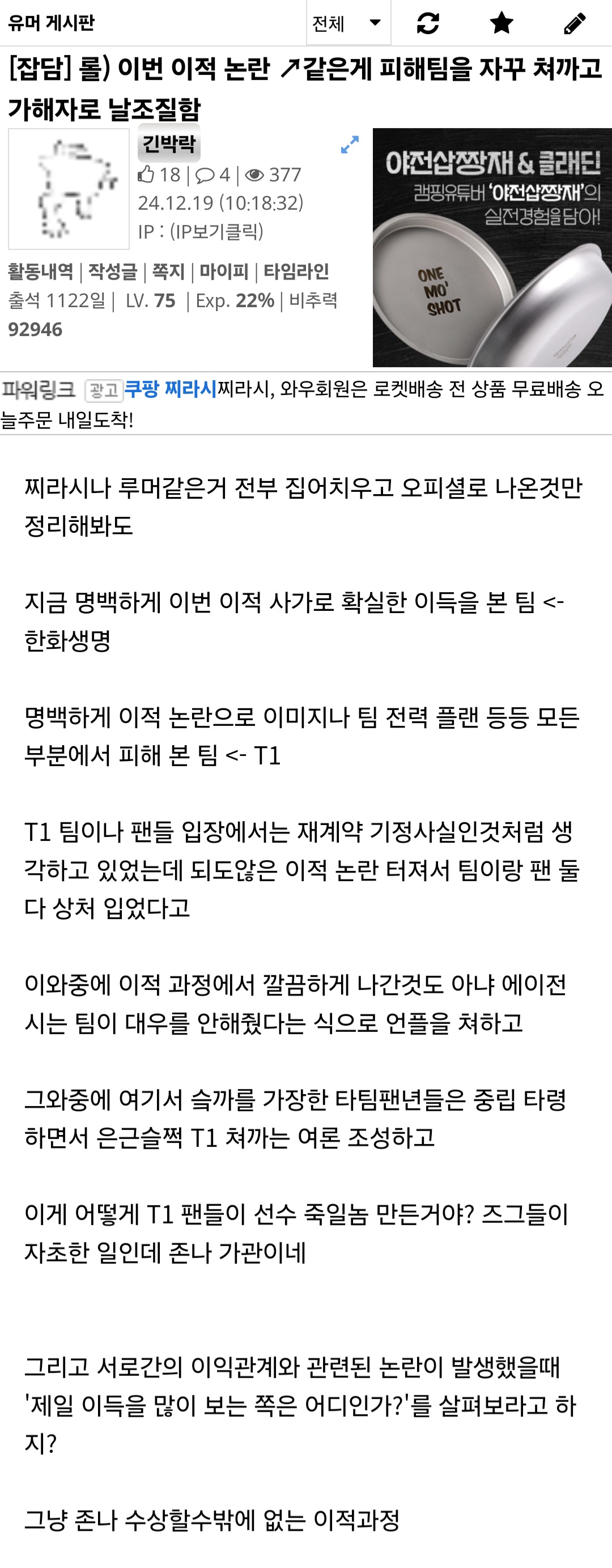 롤판에선 서로 자기 좋아하는 선수 주전 안된다고 주전자리 뺏은선수한테 사이버불링하고 타팀 이적한선수한텐 탬퍼링이라며 누명씌우고 욕하고 개판임 아주 이런꼴 안날려면 조심해야됨