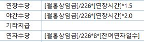그리고 주당 40시간 넘어가는 근로에 대해서는 연장 근로수당 *0.5 야간 10시 이후 익일 오전 6시까지는 야간 근로 수당이 다시 0.5 가 붙어서 2.0 으로 계산해야 됨 휴일에 연장.야간.휴일 이면 근로시간 * 2.5 로 추기 근무에 대해서 계산해서 합하고