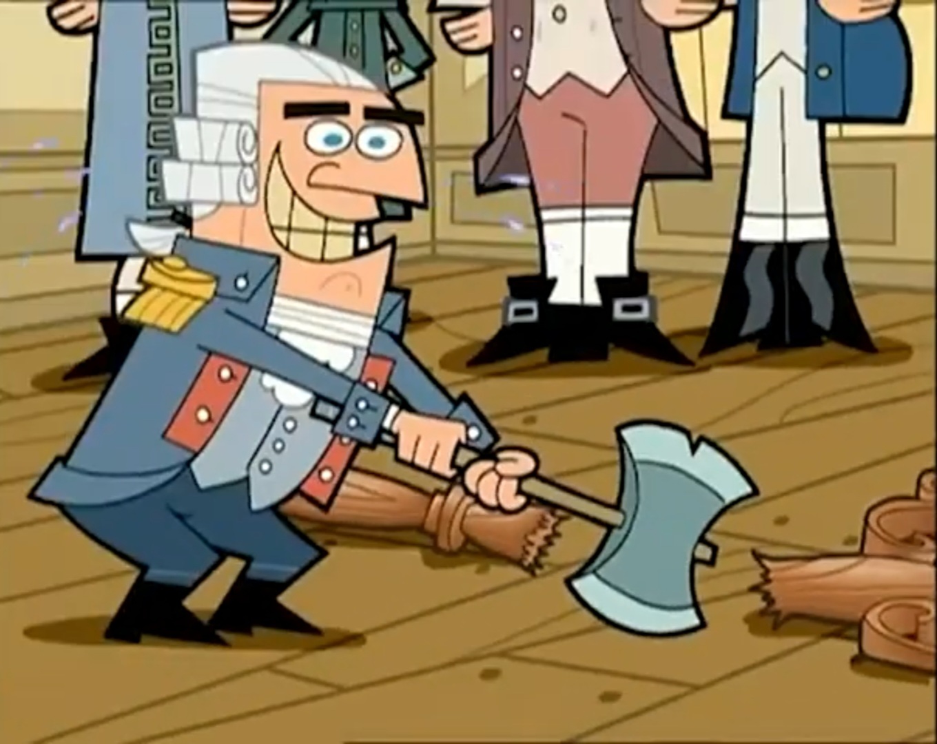 워싱턴(도끼 장착) : 아부지 죄송합니더. 아부지 : 괜찮다. 정직한 게 제일이다. 그러니 도끼는 위험하니 내려놓자.