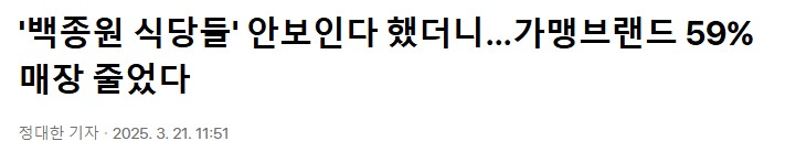 그래서 백종원이 방송 안하면 더본은 유지가 안됨 왜냐면 더본 정도 폐업률인 프차에 사람이 몰리는거 자체가 방송이라서 가능한거든 | 25.03.23 09:17 | | |