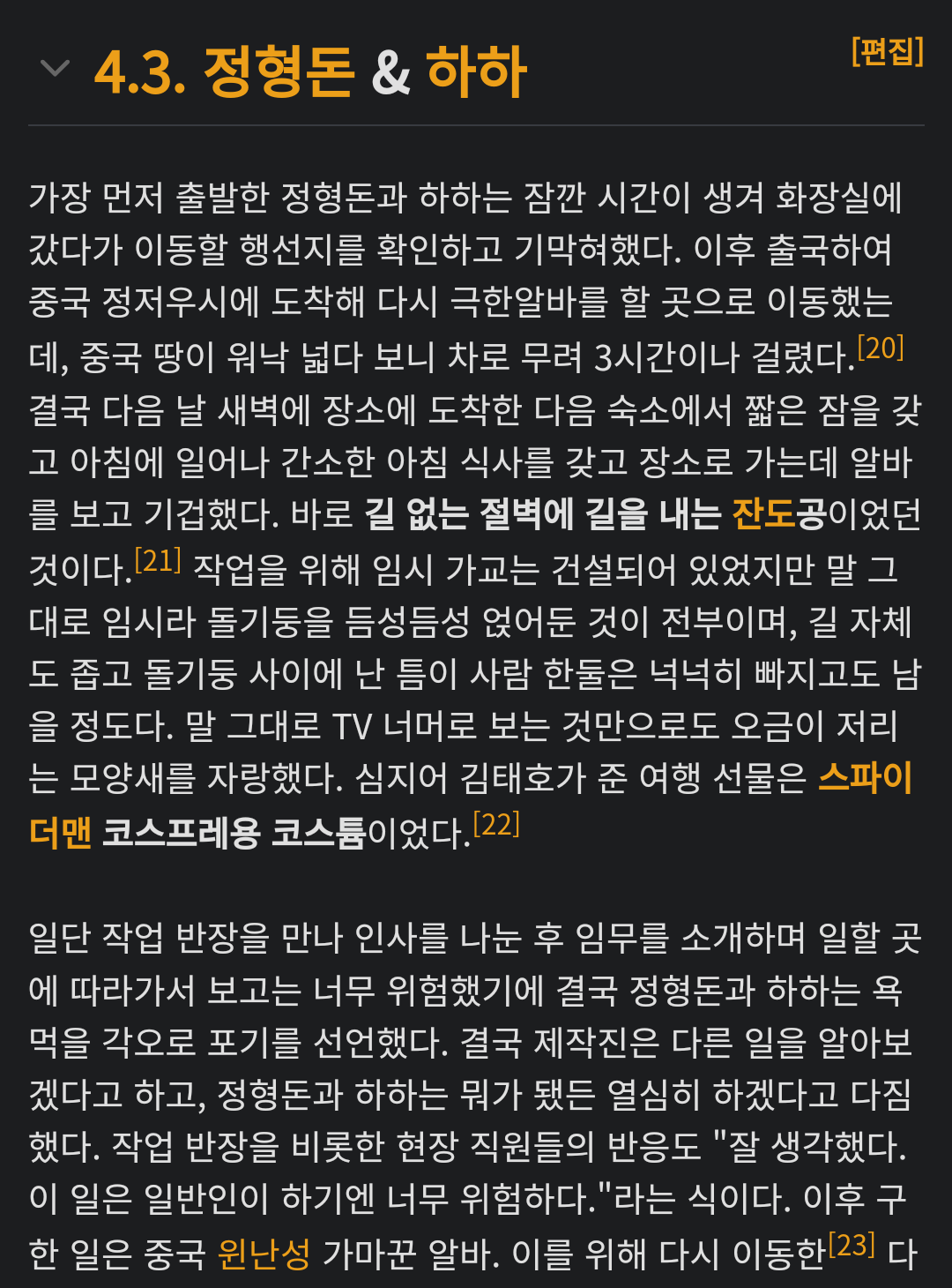그리고 정형돈의 경우 가마꾼으로 몸을 혹사하는 바람에 촬영 갔다와서 다른 촬영에서도 지장이 갈 정도라 겨우 찍었다고 하지 | 25.03.23 13:47 | | |