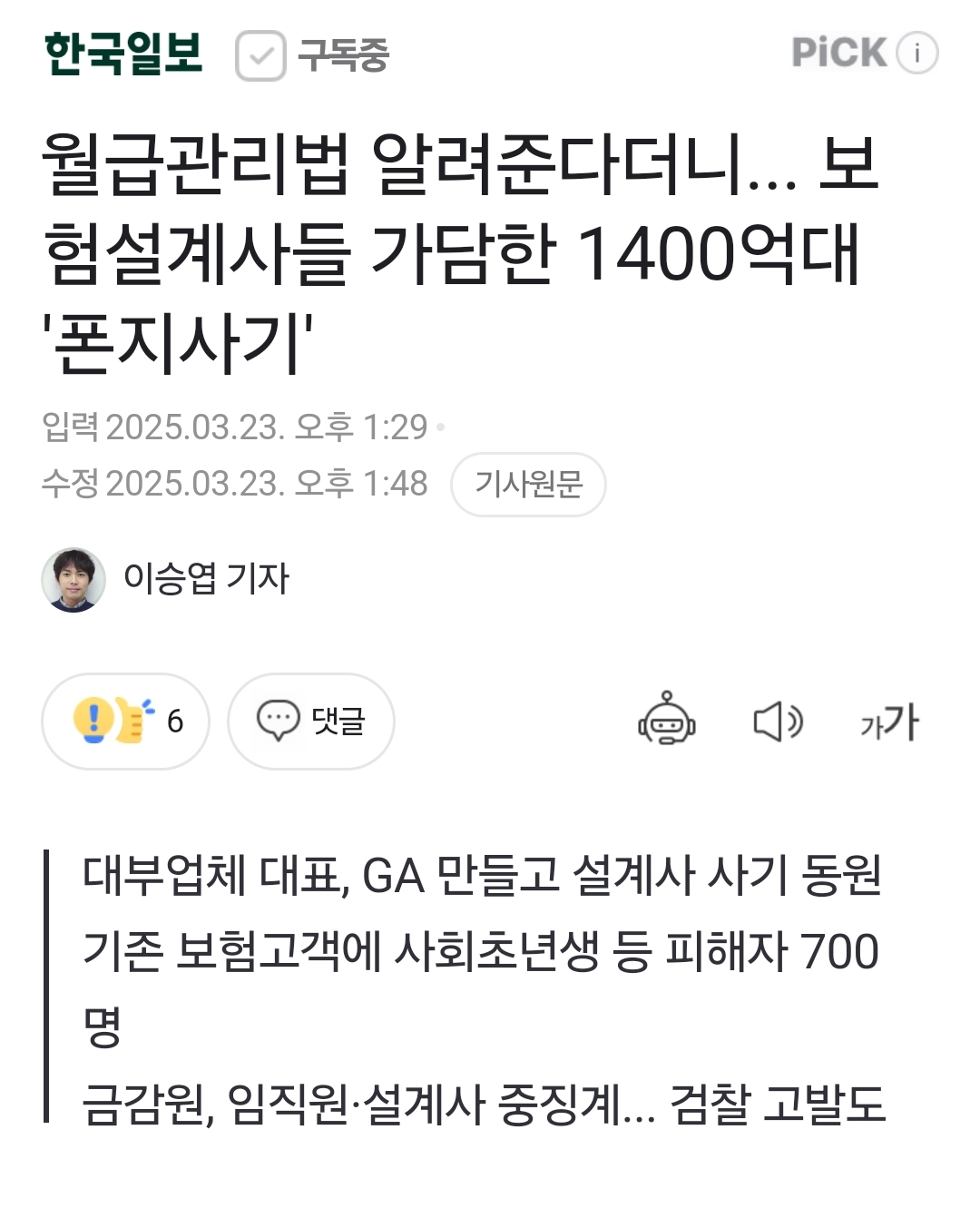 보험 대리점이라고 보면됨. 근데 그 자체가 규모가 꽤 큰 상황임. 보험 업계에서는 원래 설계사라고 하는걸 하나의 회사에 속한 경우가 많았는데 저건 GA라해서 생명보험, 손해보험 모두 취급하는 대리점임. 장점은 여러회사 보험 취급이 가능하다는거고, 단점은 관리가 잘 안됨. 일반적인 한회사에 속한 보험설계사보다 취급 권한이 적은경우가 많거나 업무처리 방식이 설계사나 지점에서 대부분 처리 가능한 전속 설계사(회사 소속)와 다르게 대리점 방식이다보니 설계사가 뭘 어떻게 못하고 거기에서 2~3단계 건너건너 처리를 해야함 요즘엔 GA가 일반 전속설계사(회사소속)보다 규모가 커진 상황이라...한동안 금융당국에서 GA쪽 예의주시할 가능성이 높음..아무래도 전속설계사보다 문제가 터지는건 GA가 많은 느낌이라... | 25.03.23 19:17 | | |
