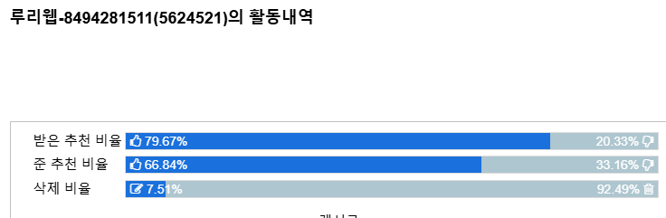 삭제 비율은 여러 이유로 높은 사람이 많아서 지표로 쓰기 좀 그럼. 의견 좀 다르면 활동내역 소환 하는건 자제하자 | 25.03.23 22:37 | | |