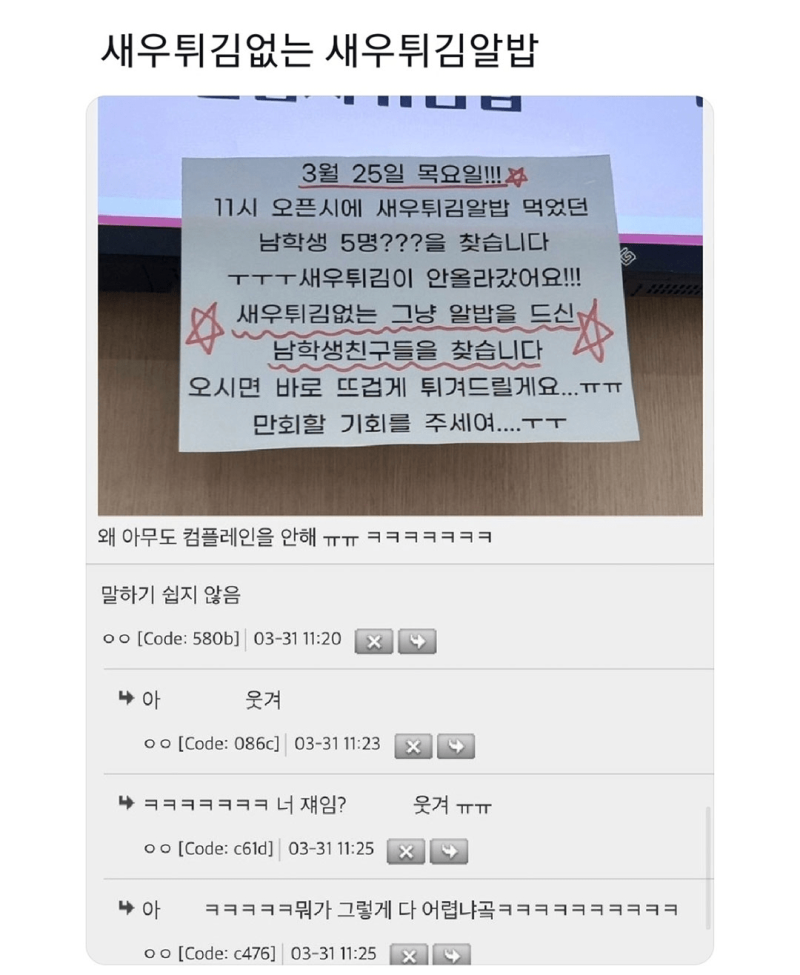 ???:야 지난번에 저기 새우튀김알밥에 새우튀김은 안주더라 | 25.03.23 16:08 | | |