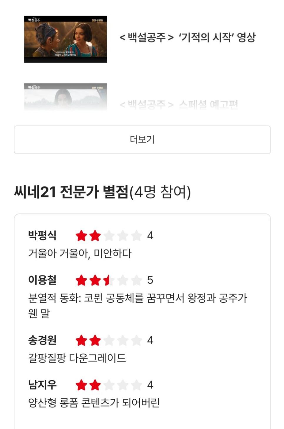 먼가 안 예쁜건 아닌데 눈 사이 거리가 너무 먼 편이라 거기서 오는 불편감이 있는 거 같고 아무래도 백설공주하고는 어울리지 않는 데 스토리 자체를 통념적인 거하고 거리를 두게 만든거라 아예 노리고 캐스팅 한건가 싶네 | 25.03.23 21:01 | | |