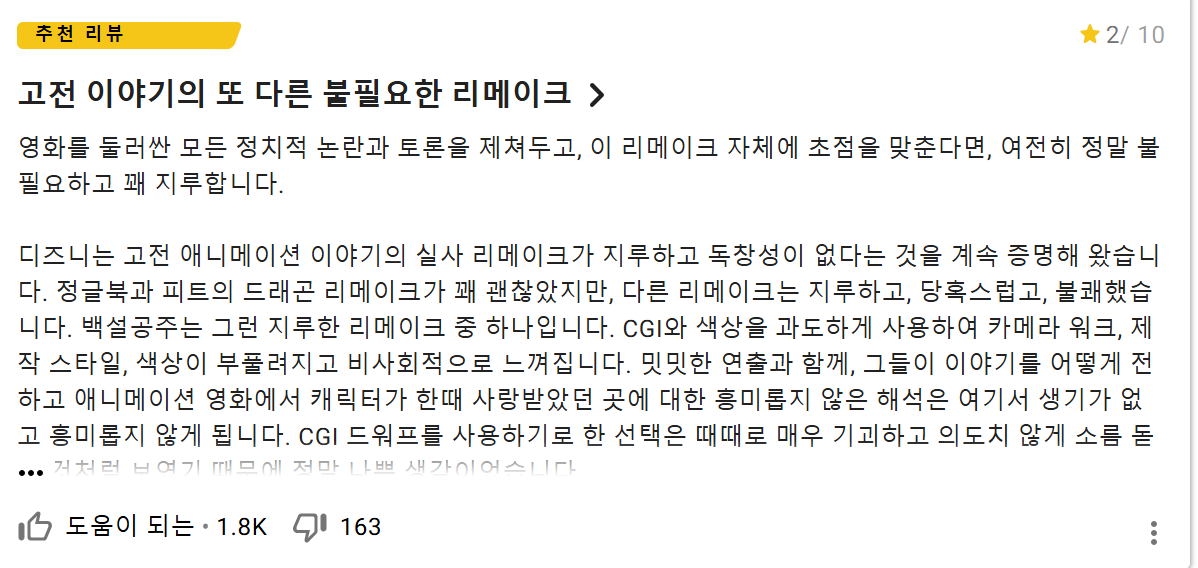 백설공주의 캐릭터성도 죽여버리는 바람에 진짜 농담아니고 백설공주란 제목 뺴면 공산주의 홍보 영화같음;;;;;; | 25.03.24 22:10 | | |