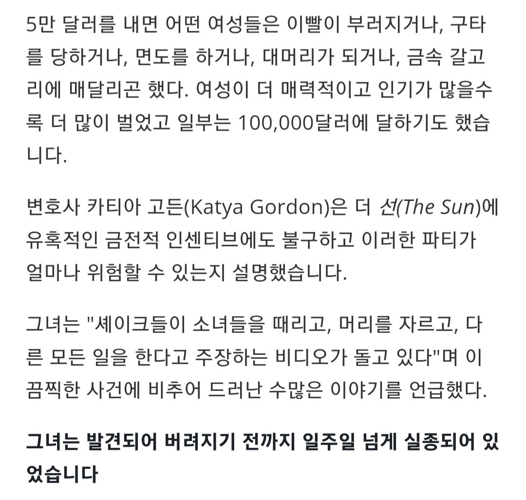 For $50,000, some women would have their teeth knocked out, get beaten, get shaved bald, or be hung from metal hooks. The more attractive and popular a woman, the more they made, with some even reaching up to $100,000. 기사를 보면 그 포르타뭐시긴지 5만달러면 이가 부러지도록 두들겨 맞고 강제 삭발을 당하든가 뭐 그런 짓을 당할 수도 있다고 하던데 고작 5만달러에 이가 부러지도록 폭행을 당한다는게 뭔가 말이 되나 싶기도 하고;;; | 25.03.24 19:21 | | |