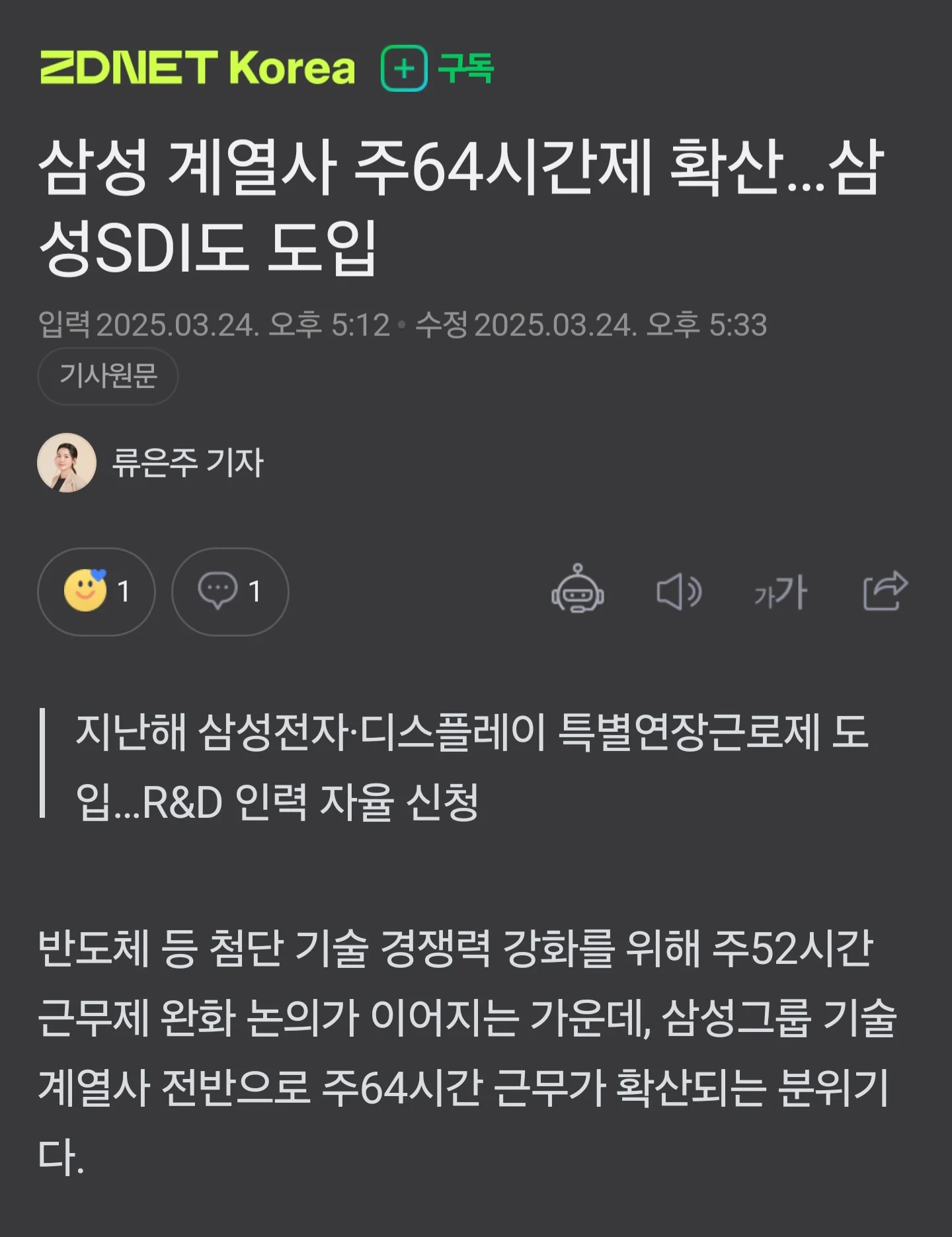 당장 돈 정상지급 기준으로 60시간 일한다치면 총 임금 상승폭이 1.75배가 증가함. 아무리 삼성이여도 인건비로 이걸 다태울순없음 | 25.03.24 19:34 | | |