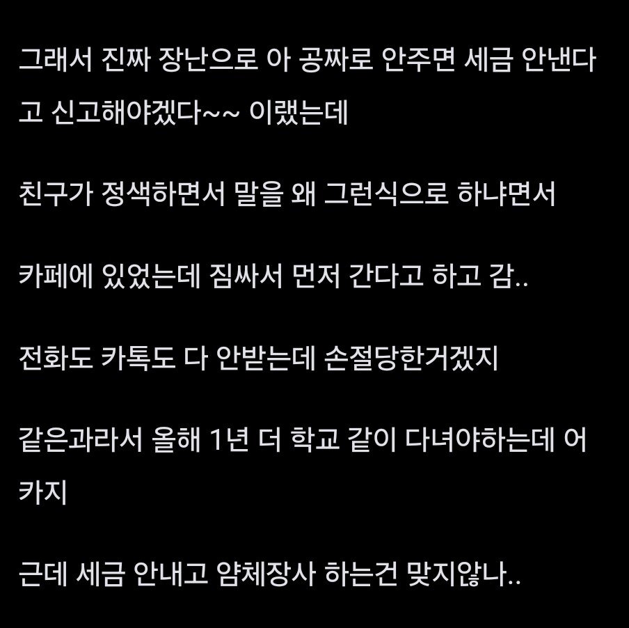 아니 친구 아버지가 푸드 트럭 하는 것에 ㅇㅇ이 친구에요 공짜로 주세요를 안하면 신고한다는 새끼가 왜 친구야 | 25.03.24 20:00 | | |