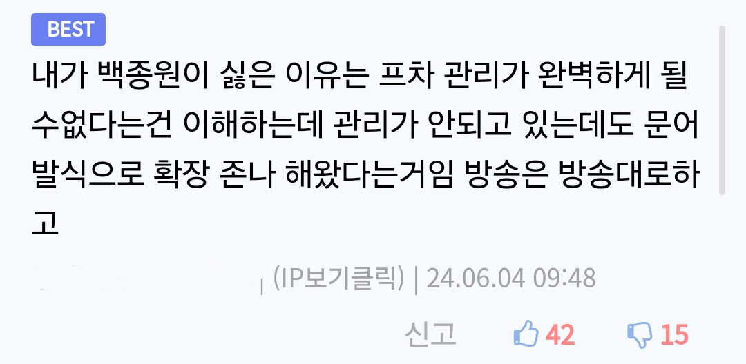 내가 님 말보고 백종원 관련 내용 찾아봤는데, 이건 양반임.. 이건 그래도 42 : 15잖아. 비슷한 댓글인데, 비추 폭탄만 받은 댓글도 수두룩 함.. 이건 홍콩반점 이슈터진 이후라서 양호한겨. | 25.03.24 21:58 | | |
