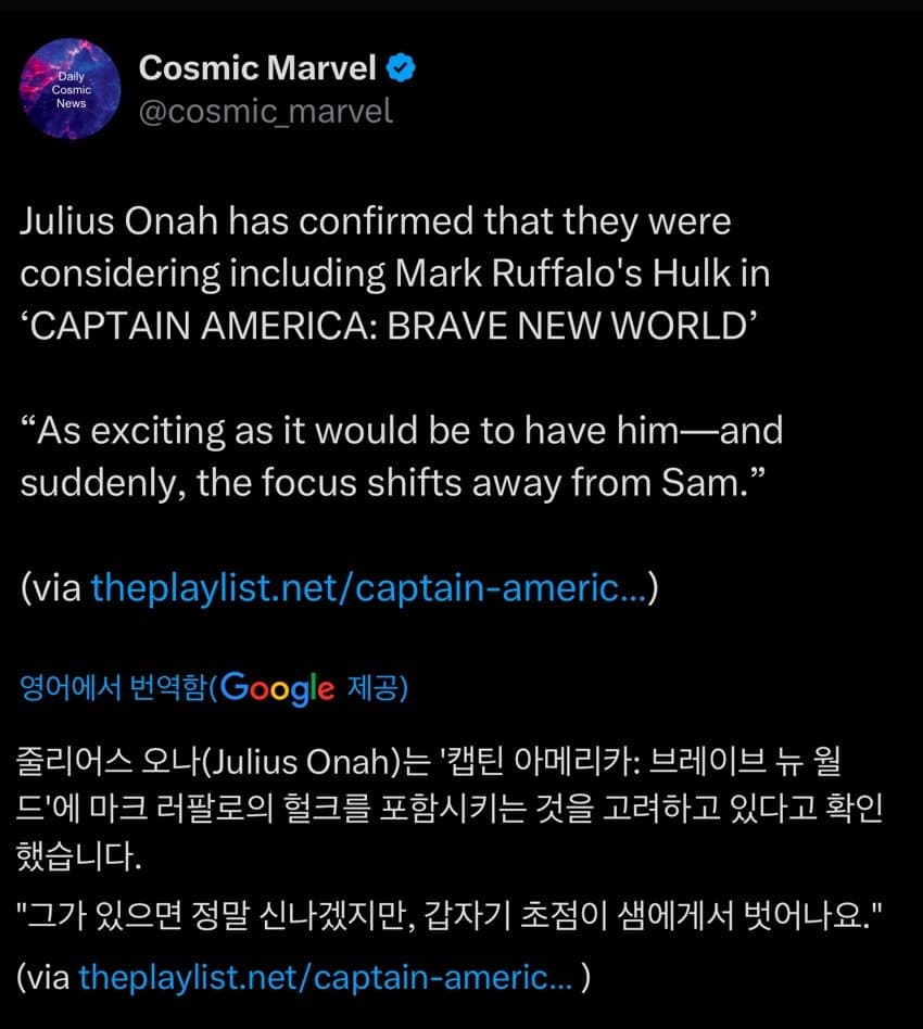 누가 말했는데 저렇게 원래 엔딩대로 가면 샘은 대통령 살해 낙인 찍히는거라 MCU내에서도 현실에서도 구설수로 시끄러워질수밖에 없어서 바꿨다는게 설득력있더라. | 25.03.25 10:36 | | |
