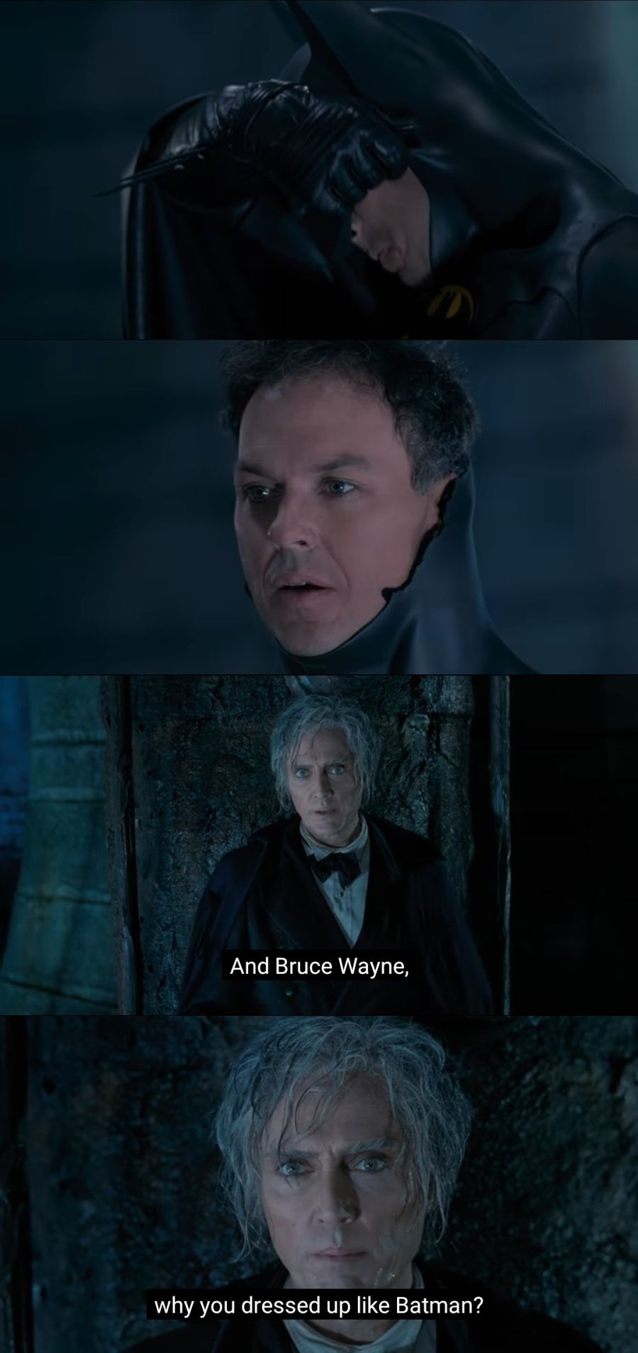 브루스 웨인 : 내가 바로 배트맨의 정체요! 사람들 반응 : 브루스 웨인? 왜 배트맨옷을 입고 있소?