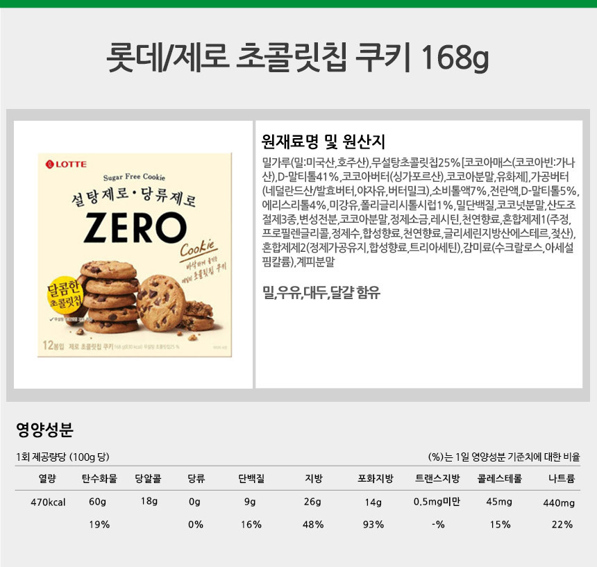 여기 당알콜이 ~~톨, ~~올 로 끝나는 감미료임. 원재료를 보면 말티톨, 소비톨, 에리스리톨, 폴리글리시톨이 해당됨. 말티톨과 소비톨이 설탕의 50~60 % 정도, 폴리글리시톨이 70% 정도의 열량을 가짐. 그래서 대략 당알콜 18 g = 10 g 정도 보면 됨. 그런데 문제는 이게 아니라 탄수화물임 탄수화물이 60 g 들어 있는데, 당뇨환자에 권장되는 탄수화물 1일 섭취량 인 100 g 의 60 % 임. 과자류는 들어있는 탄수화물을 "0 "으로 하는게 사실상 불가능하다보니 진정한 의미의 "제로" 칼로리는 만드는게 사실상 불가능에 가까움.
