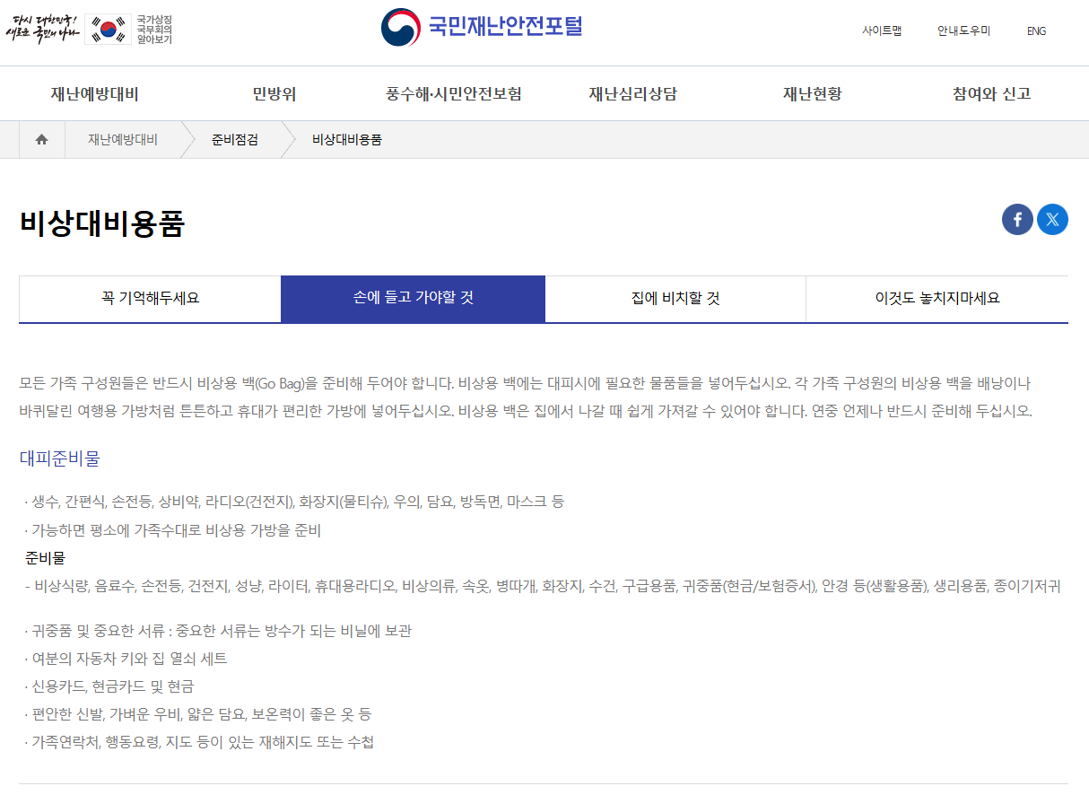 필요함. 단순히 우리집에 문제가 생긴 정도라면 상관없지만, 보통 저게 필요한 시점에서는 해당 지역을 벗어나야 할 가능성이 큼. 그리고 우리나라 정부에서 권장하는 생존배낭 구성품들은 지정된 대피소까지 이동하는데 필요한 물품과 대피소에 도착해서 구호물자 배급 할때까지 필요한 물품, 구호물자로 배급하기 어려운 물품으로 구성되어 있기 때문에 해당 물품등을 준비해 놓는 것이 좋음. 그리고 유사시 행동요령 같은 경우는 우리나라 정부에서 배포하는 자료도 좋지만, 일본 도쿄도에서 배포하는 "도쿄 생활 방재" 한국어판 PDF를 보는 것도 좋음. 역시 많이 해본 애들답게 생각지 못한 소소한 팁이 많이 들어가 있음.