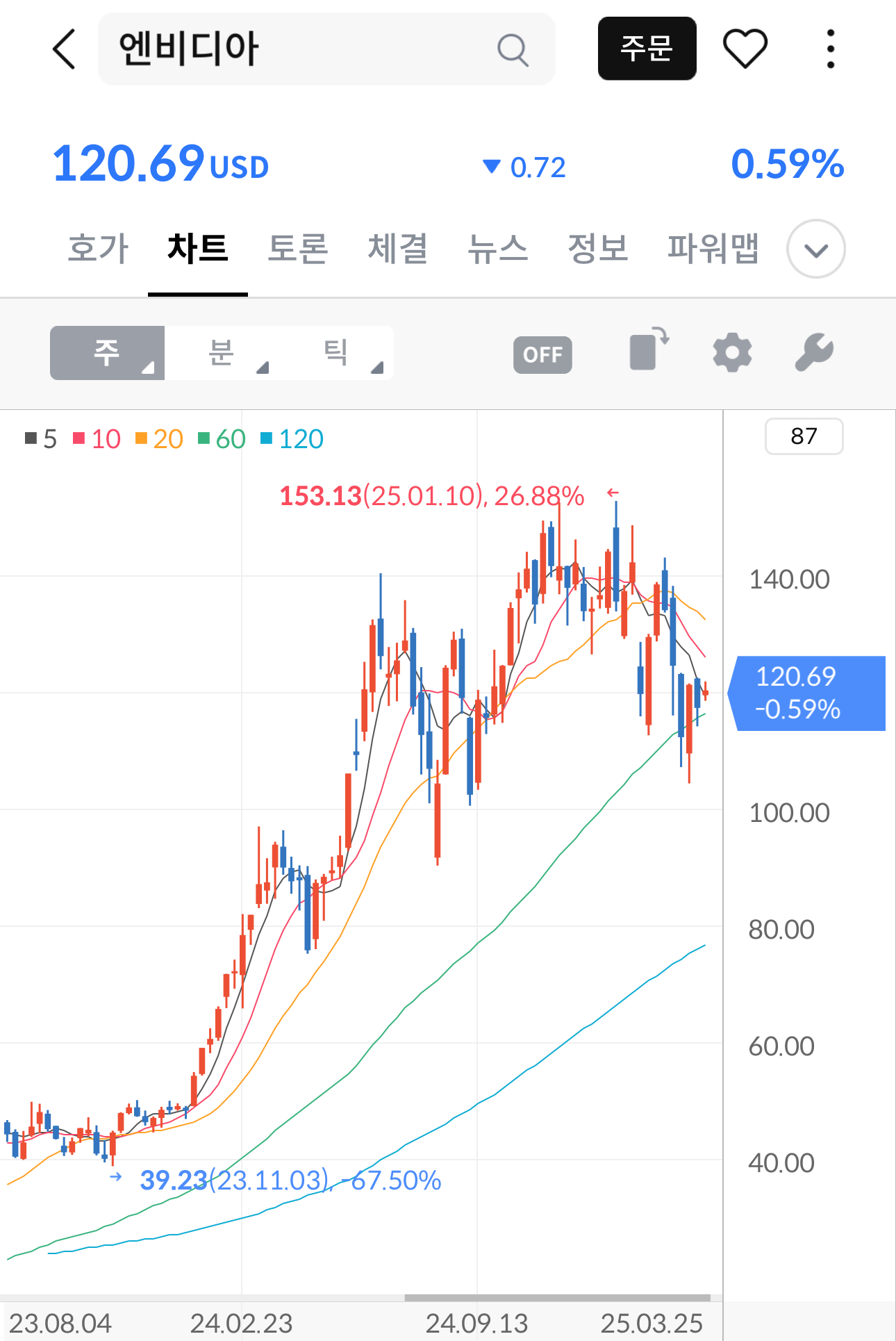 엔비디아가 작년 9월경부터는 크게 오르고 내린 날이 있기는 하지만 아주 크게 이익이 날 정도로 떨어지는 경우가 드물고 그걸 아직도 들고 있다면 당연히 원금은 녹는다 | 25.03.26 16:14 | | |