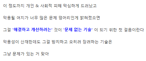 총도 위대한 발명이라 인류가 더이상 맹수를 두려워하지 않게 됨 근데 총의 문제는 인공지능 문제보다 압도적으로 크지 총이 문제가 아니라 총이 존나게 풀리고 아무렇게나 사용되는 동네의 문제잖아 한국에서 총기난사 같은게 어디 흔한가 기술은 언제나 중립적이고 문제는 제도가 일으키는긔임 | 25.03.26 17:42 | | |