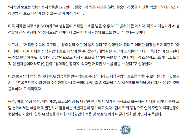 그법은 애초에 딸깍 하고 저작권 올리는걸 인정 안하는거지 AI를 도구처럼 사용하고, 사람이 구성, 선택, 편집에 적극적으로 개입한 경우는 허용이라 의미없는법임 딸깍후에 선 한줄 그은거랑 적극적 수정한거는 누가 정할거냐는 문제가 있어서 너무 모호함 | 25.03.26 17:43 | | |