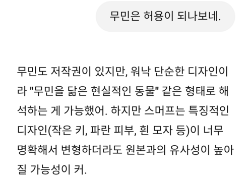 전에 스머프를 동물 모습으로 그려달라고 했더니 저작권 때문에 생성이 안된다고 하더라고. 그런데 무민은 그려주더라. | 25.03.26 17:58 | | |