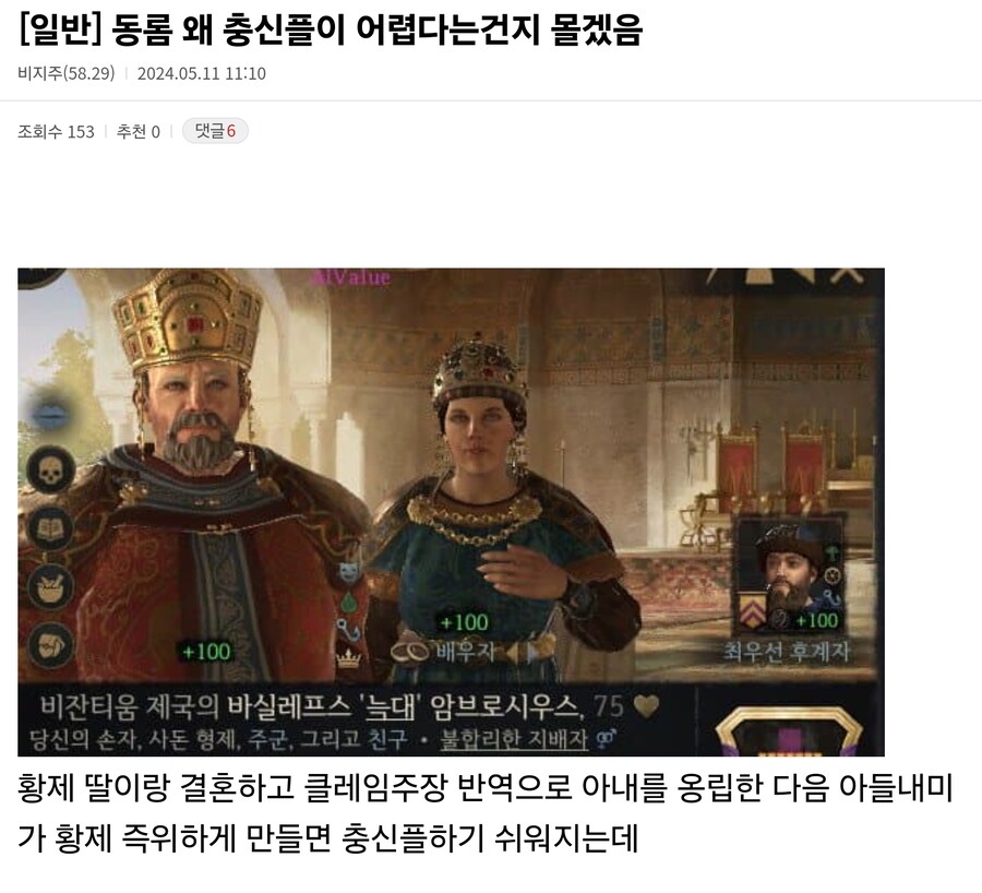 역으로 아무리 대귀족 대부분과 전군이 찬탈자를 지지하고 가망이 없어도 황제가 죽기직전 후계자를 임명하면 목숨걸고 후계자 지켰음. 명군 요안니스 2세가 이렇게 살아남아서 제위계승함 | 25.03.26 21:56 | | |