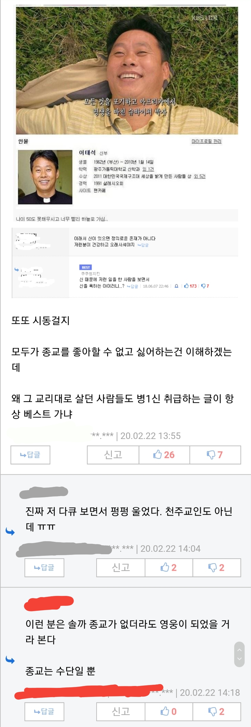 자칭 이성과 합리의 화신인 커뮤니티 무신론자 특) 자기들 감성에 함 취해보겠다고 평생 사랑과 신앙으로 살아온 훌륭하신분 인생을 부정함