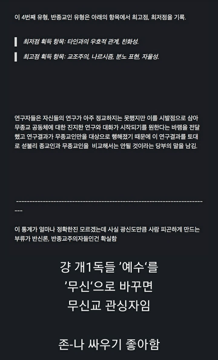 흔히 욕들어먹는 아브라함계 종교도 그렇고, 여타 다른 종교 교파들도 그렇고 흔히 과학적인 사고방식이라는 관점에서 자기네들 교리에 논리적 오류가 있음을 부정하는 교파는 그리 많지 않음 그걸 인정하고 들어가는 것을 꼭 거기만 후집어파면 종교쟁이 박멸 가능하다고 믿는 애들인데 난 얘들을 '무신론교의 광신자'라고 부르곤 해. | 25.03.27 03:41 | | |