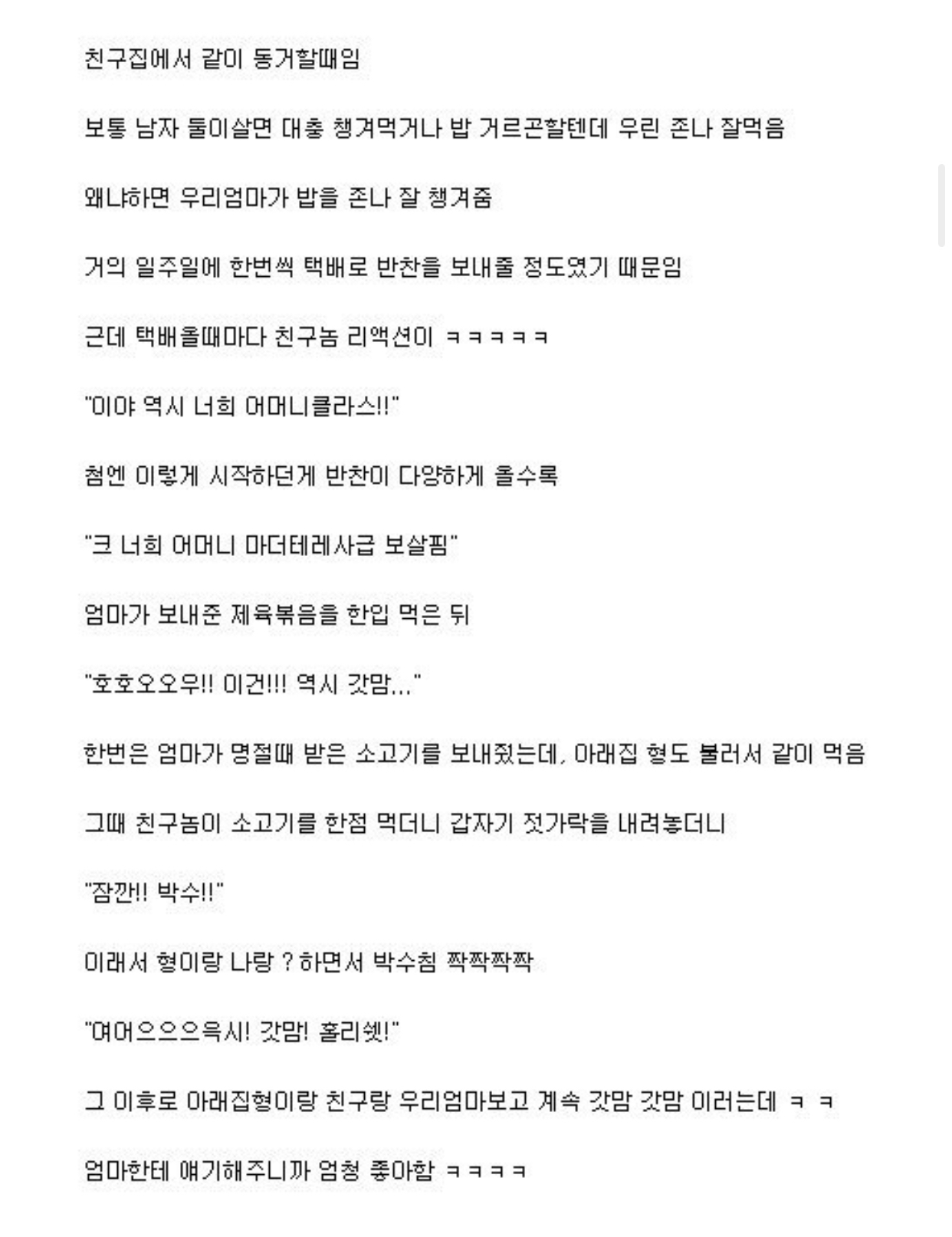음식 칭찬은 기본에 먹을때마다 와 씨 이게 대체 뭐지? 하면서 난생 처음먹는 요리인것처럼 하면 좋아하신다