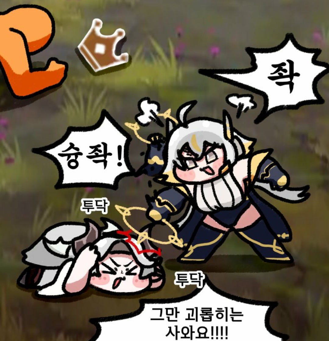 줘팸터 : 간식 뺏어먹기 쟁탈전. 지면 못 먹고 끝 디아나 : 아니 지금 슈로를 떡갈비로 만들잖아요!