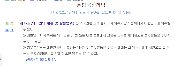 외국인의 정치시위참여 ㅋㅋㅋㅋ 한국의 출입국관리법 제17조에는 ‘대한민국에 체류하는 외국인은 이 법 또는 다른 법률에서 정하는 경우를 제외하고는 정치 활동을 하여서는 아니 된다’고 명시 ㅋㅋㅋㅋ | 25.03.28 12:23 | | |