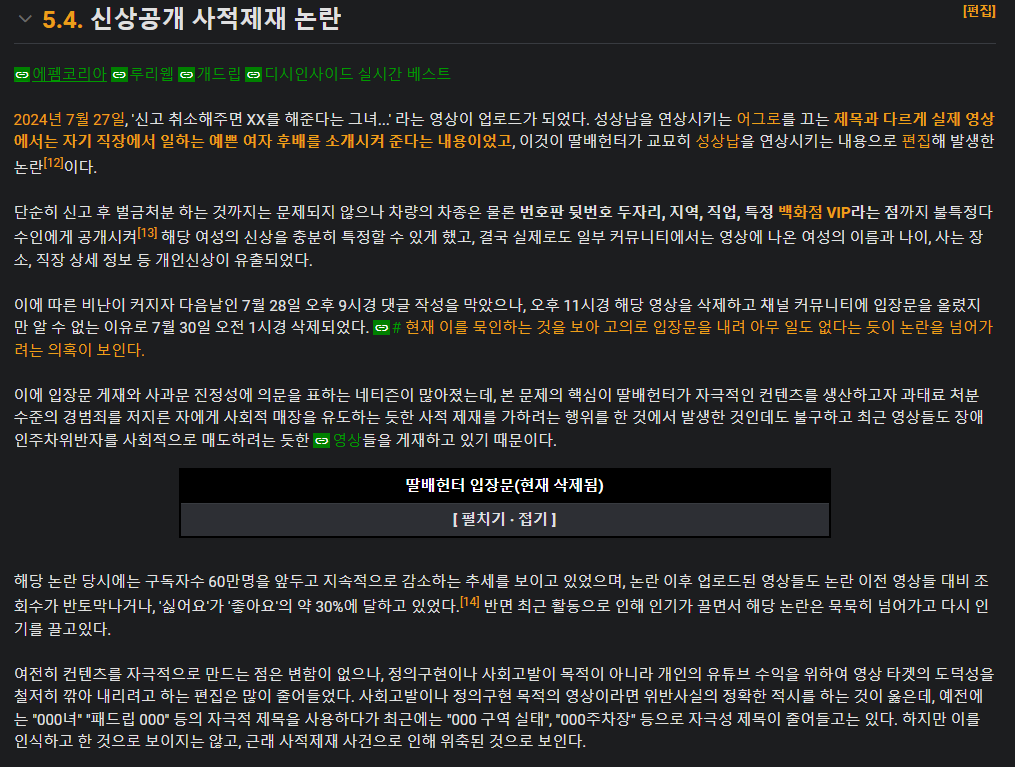 님이 말한 신상 털어서 뿌리는걸 실제로 했으면 그건 법을 어기는거라 사적제재가 맞고 고소 당하는거지. 근데 딸배헌터가 그걸 했는지는 모르겠네. 했음? | 25.03.29 11:52 | | |