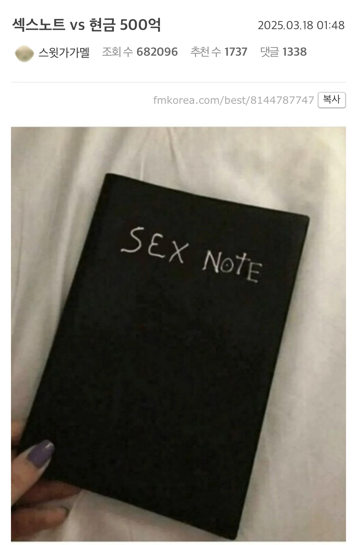 ㅅㅅ노트에 이름 적어놓고 당사자가 ㅅㅅ하자고 찾아왔을때 안해준다고하면 돈줄테니 하자고 하지 않을까