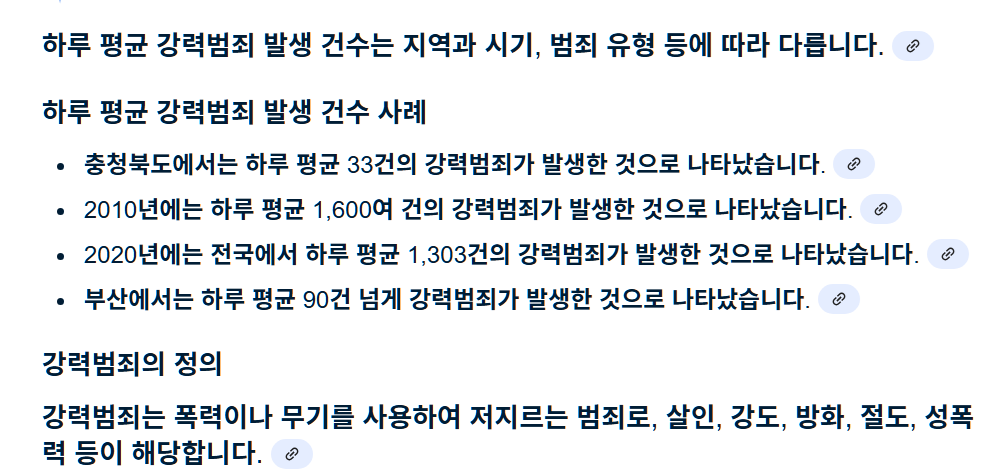 통계같은거 AI한테 물어봐도 맨날 틀리니 공식자료를 직접 찾아보는걸 추천함 참고로 경찰청 범죄통계에서 2020년 발생한 범죄는 1,587,866건 강력범죄는 24,332건임 강력범죄가 우리나라에서 하루 천건 넘게 발생한다? 조금만 생각해봐도 말이 안됨 | 25.03.28 21:27 | | |