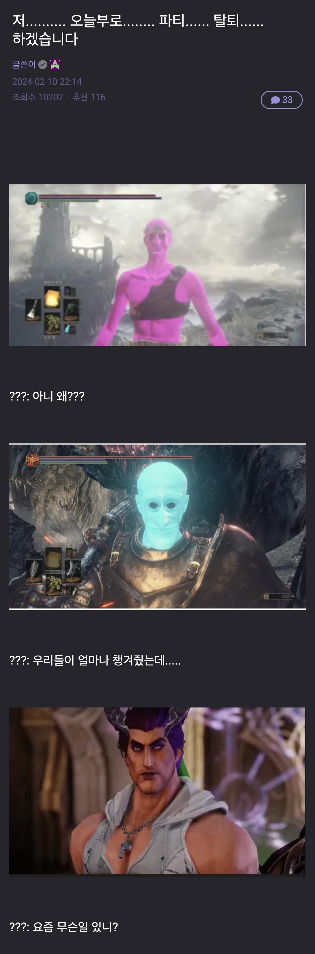 말을 잘못했군요 제 파티에서 여러분을 추방하겠습니다 아니 왜 어째서 이제부터 저도 뉴비를 겁탈할겁니다 당신들같은 고인물은 제 파티에 필요없어요