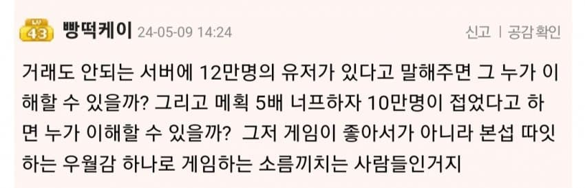 이 논리면 쌀먹 불가 패키지 싱글겜 하는 사람들은 대체 뭘 따잇하기 위해 겜을 하는 거지? | 25.03.29 00:52 | | |