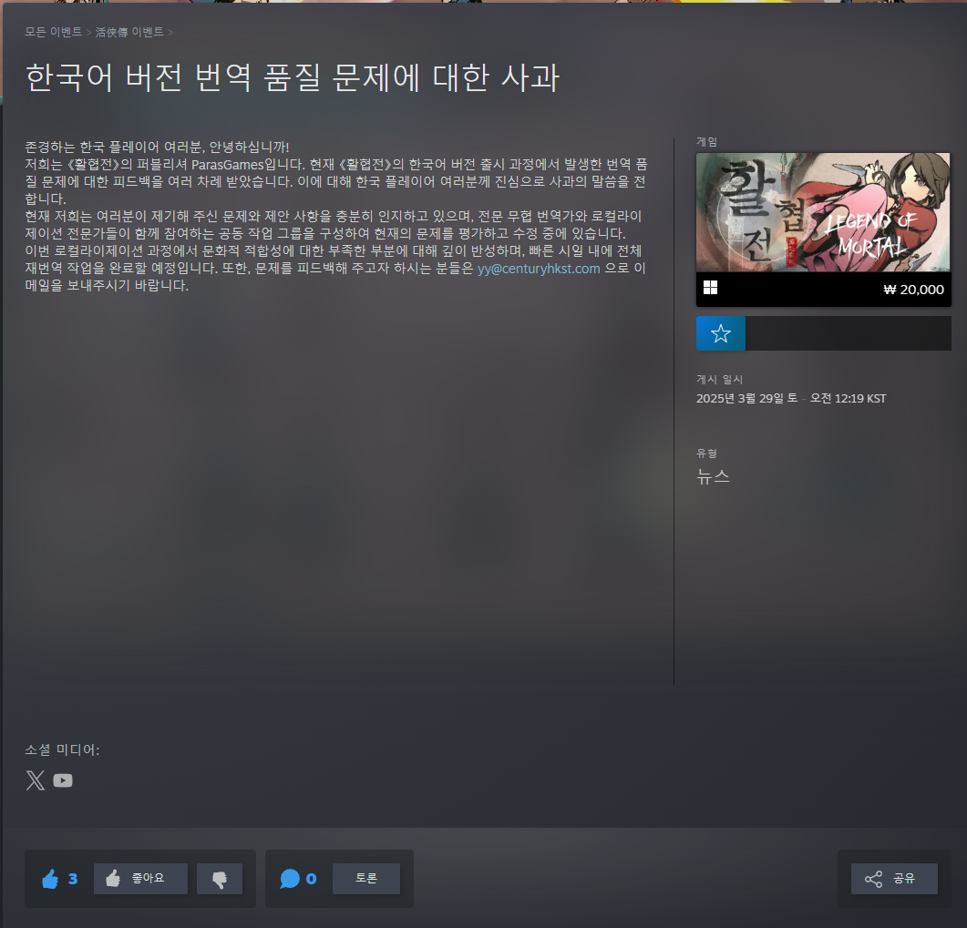 퍼블리셔가 고용했던 업체가 문제 일으킨거라고 들었음 | 25.03.29 02:19 | | |