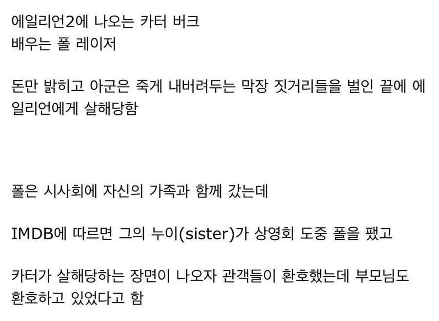 아무리 영화 스토리를 풀어가기 위함이라지만 에이리언의 dna를 간절하게 원하는 웨이랜드사가 존나 허접한 인선으로 작전을 뛰게 한게 어이없었음 ㅋㅋ
