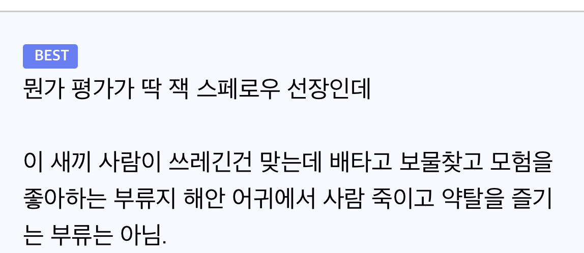 루피도 같은 부류에 넣기에는 싸움 자체를 좋아하지 않음? 잭 스페로우 느낌은 자존심이 걸린 순간에도 적당히 대충 수습하고 얼렁뚱땅 넘어가는 편이지. ㅋ | 25.04.16 19:14 | | |