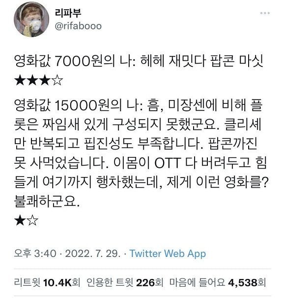 표가 쌋을때 -> 재밌나? 걍 보자 ㅋㅋ 표가 비싸짐 -> 이 영화의 평론가들의 평론은 어쩌구 예술성이 어쩌구 관련된 속편 및 후속편 예정은 어쩌구 감독의 이전작들과 평소 취향 및 발언 등등