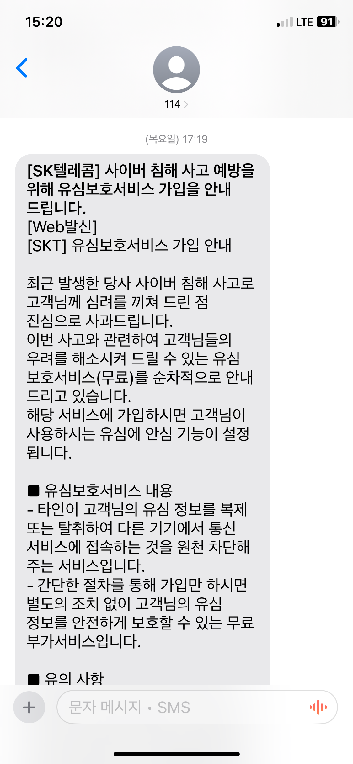 이 문자 안받은 사람들 많은것같더라 난 이거보고 유심보호서비스신청했는데 지금 할려는 사람들 밀려서 난리더라