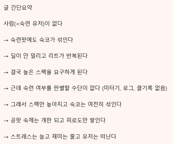 가려받는 것 까지는 모르겠으나, 객관화가 될 지표정도는 만들어 달라는 것 같아요. 던전앤파이터의 클리어횟수 정도라도 넣어달라는 것이 그 흐름인 것 같네요. 미터기까지의 살벌한 지표는 아니지만 적어도, 버스를 타고 클리어 한 것이라고 하더라도 패턴을 어느정도까지 봐왔다, 마지막 보스까지 쭉 버텨봤다, 정도의 지표는 될 수 있으니, 거기서 부터 스펙이 되니까 트라이 해보죠 정도는 되지 않을지... | 25.05.04 20:44 | | |