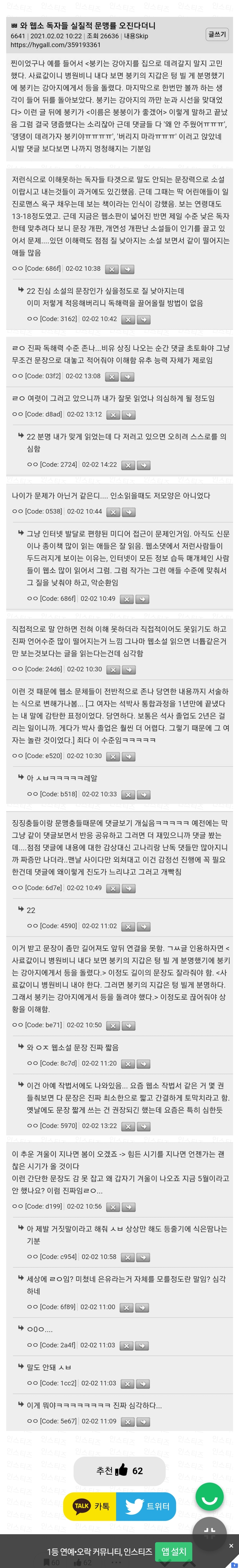 기승전결이 뚜렷하고 주인공이 온갖 위기를 겪다가 해결하는 소설 한 권과 한편씩 짧막짧막하게 연재되는 웹소설의 가장 큰 차니지 전자는 일단 붙들고 보면 결국 끝가지 보게 되지만 후자는 중간에 얼마든지 하차 가능함 | 25.05.11 14:11 | | |