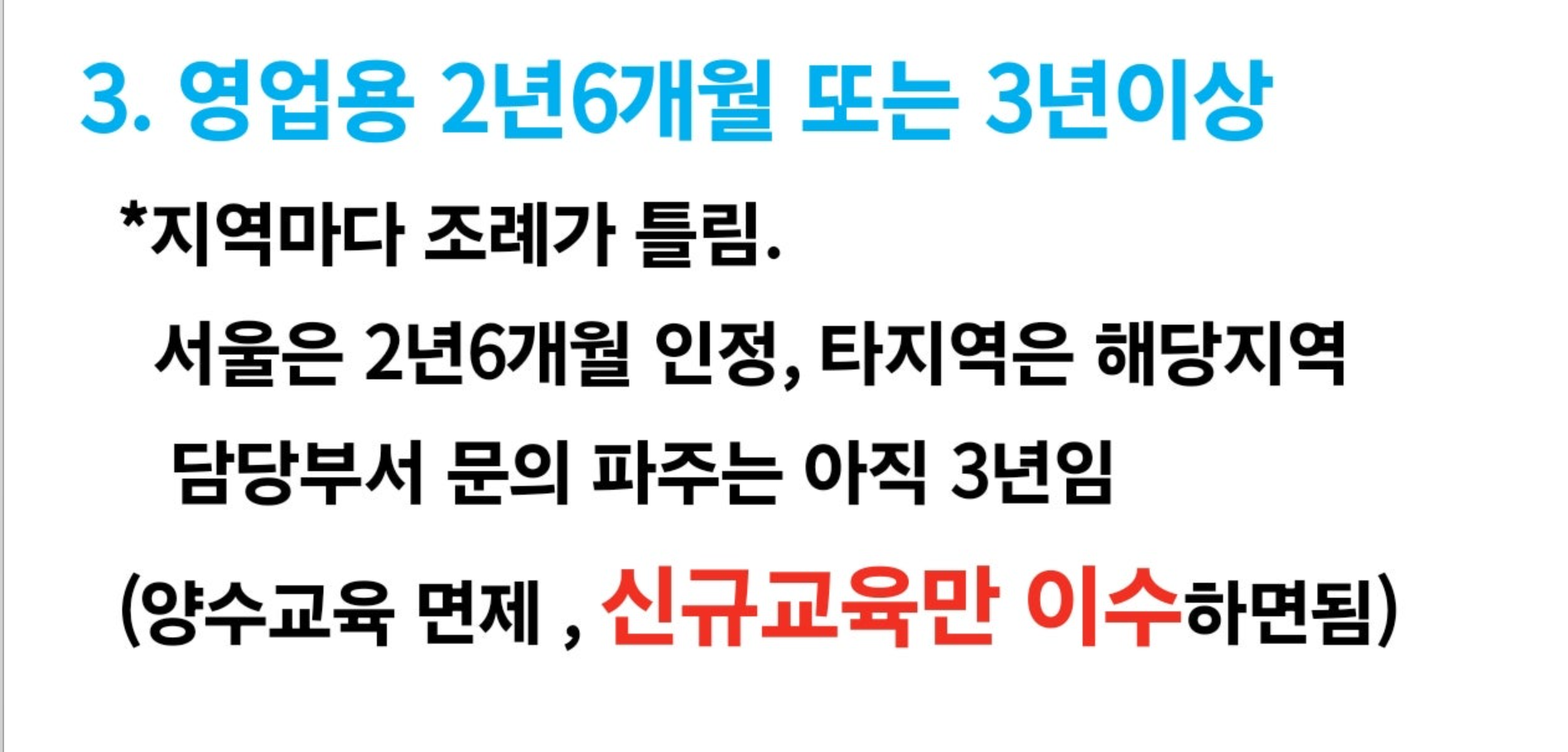검색해보니 서울기준으로 영업용 2년6개월이상일 경우 양수교육 면제네요. 반대로 양수교육을 받으면 2년 6개월이 면제 한번 확인해보세요. | 25.05.19 14:16 | | |