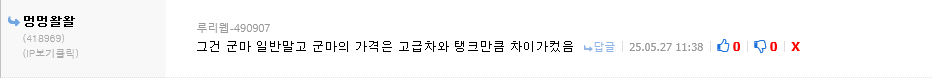 고급차도 수억에서 수십억임 하지만 탱크는 수백억임 | 25.05.28 19:22 | | |