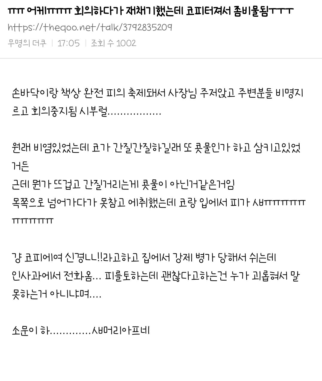 회의중 누가 피 뿜으면서 켈록이며 괜찮아요 그냥 코피에요 하면 나라도 집에 가라고 하겠다...