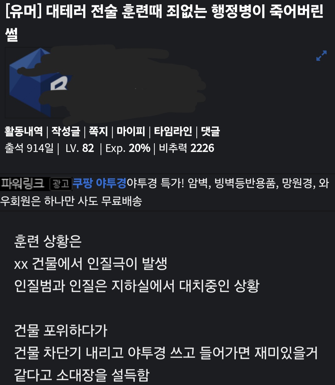 ???: "대테러 훈련인데 열심히 참가하지 않은 행정병이군."