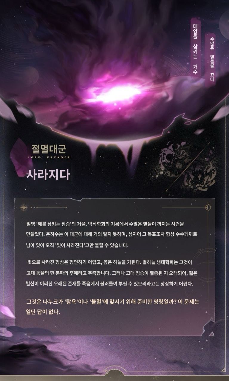얘가 고대 짐승이라는데 탐식도 황혼 고대 괴수라는 종족이라는 거 생각하면 운명의 길이 같을진 불명이지만 적어도 종족은 같은 듯