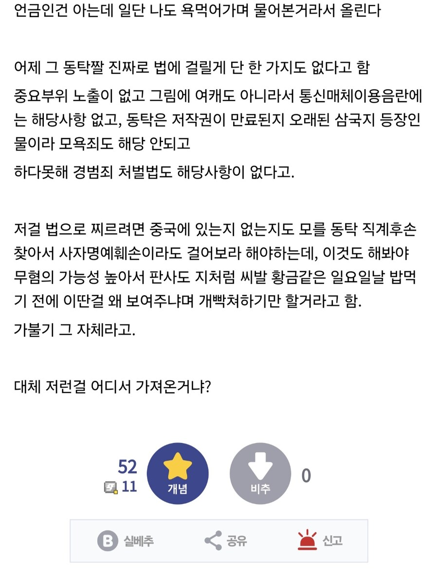 근데 커뮤니티 운영사에서 영업방해로 고소하면 이기기 힘들듯 이런 짤 올리는게 왜!! 영업 방해입니까! 재매있지 않습니까!! 판사님에게 증거를 제출합니다!! 이러면 100% 짐