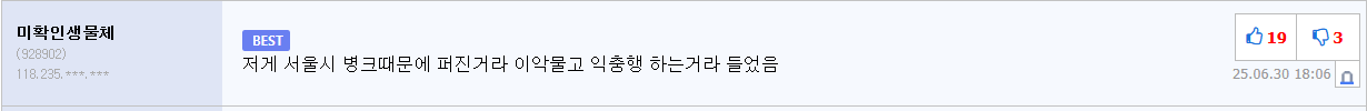 러브버그는 서울시가 잘못한거라 억지로 익충몰이 하는거다. 19/3 | 25.06.30 20:00 | | |